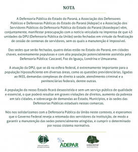 Adepar, DPPR e Assedepar manifestam-se sobre o fechamento de 43 sedes da Defensoria Pública da União