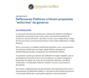 Fonte: Conjur Defensores Públicos criticam propostas “anticrime” do governo Por Gabriela Coelho A Associação Nacional das Defensoras e Defensores Públicos (Anadep) se manifestou, nesta quarta-feira (20/2)