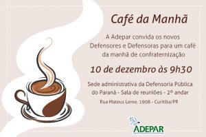 A Adepar (Associação dos Defensores Públicos do Paraná) convida os novos Defensores e Defensoras do Paraná para uma confraternização. O café da manhã será no